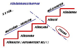 Förändringstrappan brukar användas för att beskriva hur människor hanterar förändringar. När det gäller oljans knapphet skulle jag säga att vi fortfarande befinner oss på stadiet förkasta. Om du frågar någon på stan om de tror att oljan håller på att ta slut skulle nog de flesta svara nej. Som förklaring till det höga oljepriset framhålls spekulanter och giriga oljebolag som bovar, inte geologiska begränsningar.