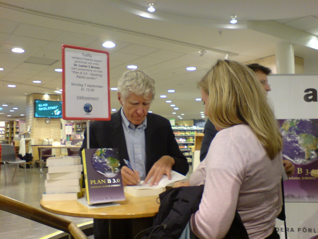 Lucas tipsade om att Lester skulle besöka Stockholm för att introducera den svenska översättningen av Plan B 3.0 – Uppdrag rädda jorden. Jag begav mig till Akademibokhandeln på Mäster Samuelsgatan i Stockholm för att höra vad han hade att säga.
