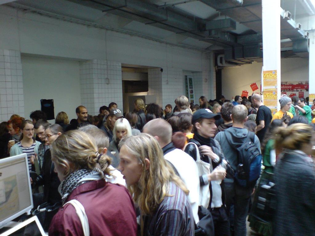 Efter att en kompis frågat om vi ville följa med på Vegomässan åkte vi igår till Kungsholmen i Stockholm för ett besök. När vi kom fram till Enskilda Galleriet vid 14.00 ringlade sig kön lång längs Kronobergsgatan. Vi bestämde oss för att gå en sväng till Västermalmsgallerian för att återkomma senare. När vi kom tillbaka vid 15.30 var kön något kortare men fortfarande massiv. Vi ställde oss snällt sist och det rörde sig ganska snabbt framåt. Efter c:a 30 minuter fick vi betala och träda in i Galleriet.